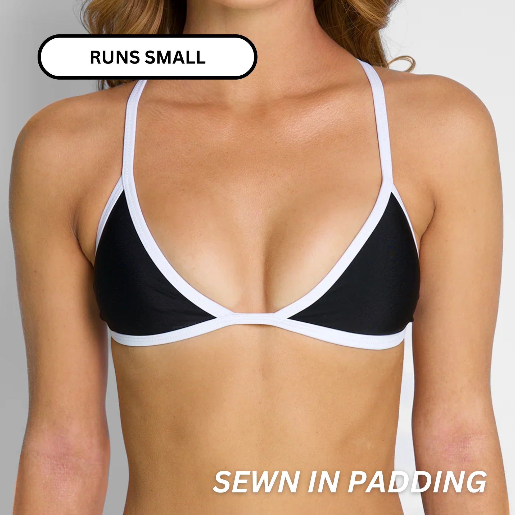 Lily, our new triangle top features sewn in cup pads and has a criss cross tie back. Constructed of dense, double layered fabric, our swimwear is designed to hug every curve while providing the functionality of staying in place during any sun soaking activity!